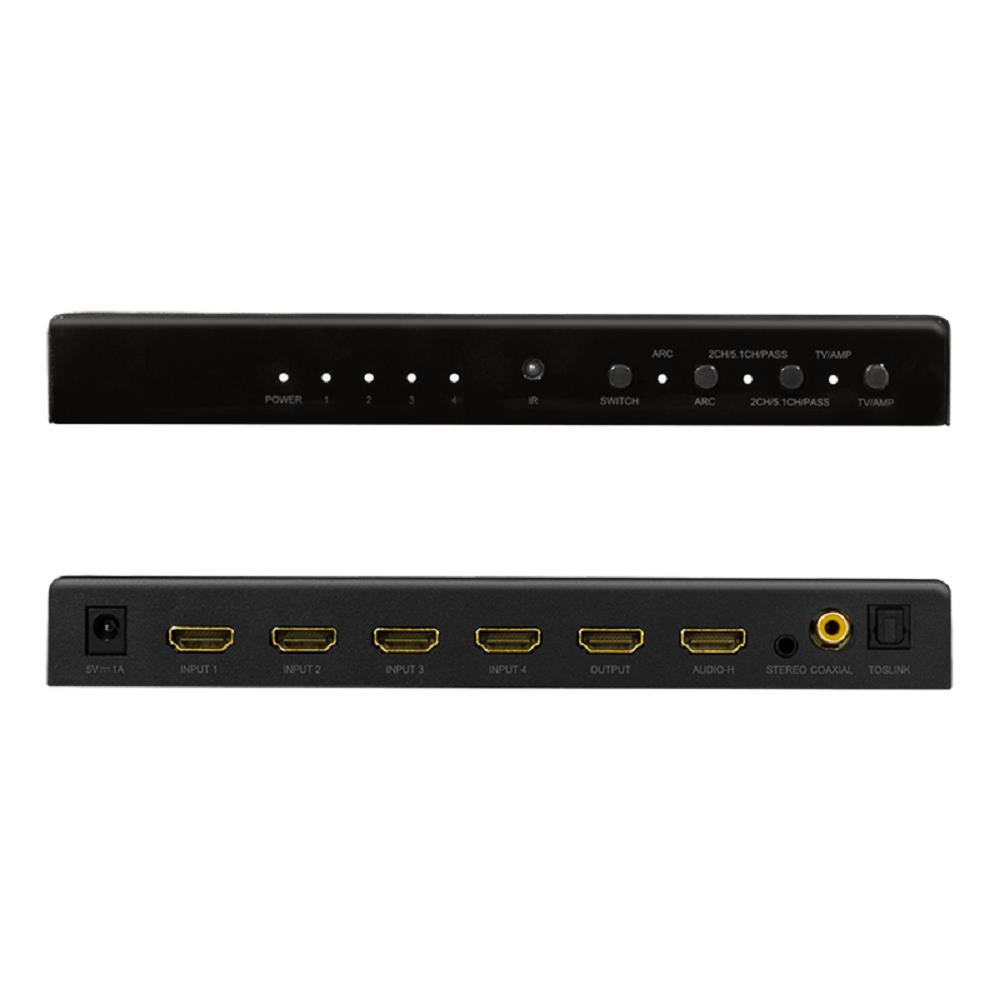 - Anschlüsse In: 4x HDMI-A, DC-Strom, Anschlüsse Out: HDMI-A, 3,5-mm-Klinke, Koaxial, SPDIF (Toslink), HDMI-A-Audio