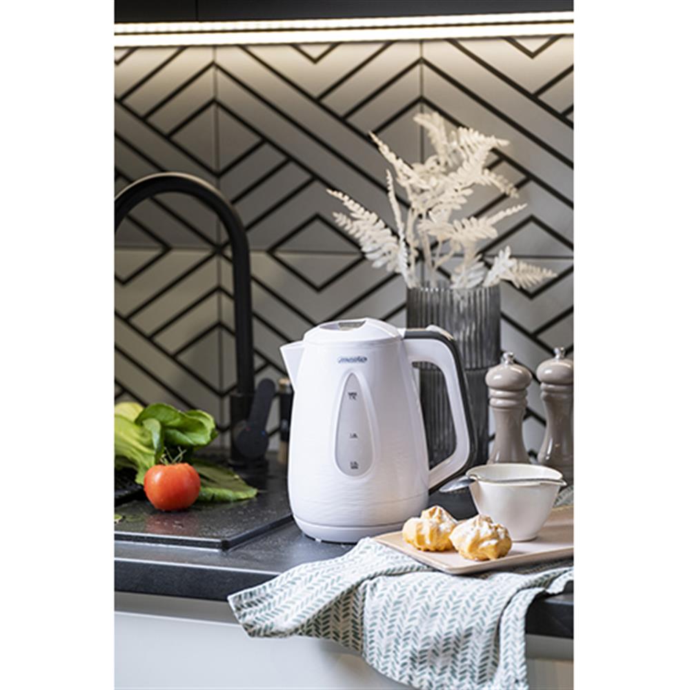 Der Wasserkocher ist mit einer hellen Wasserstandsanzeige und einer Abschaltautomatik ausgestattet, so dass er sich ausschaltet, wenn das Wasser kocht. Der Trockengehschutz verhindert das Einschalten eines leeren Wasserkochers, was Energie spart und die Sicherheit des Benutzers erhöht. Außerdem sorgt ein Sedimentfilter für eine angemessene Wasserqualität. Für die Bequemlichkeit der Benutzer wurde der Wasserkocher mit einem um 360 Grad drehbaren Sockel und einem flachen Boden ausgestattet. Moderner und praktischer Wasserkocher. Er fasst bis zu 1,7 l Wasser.