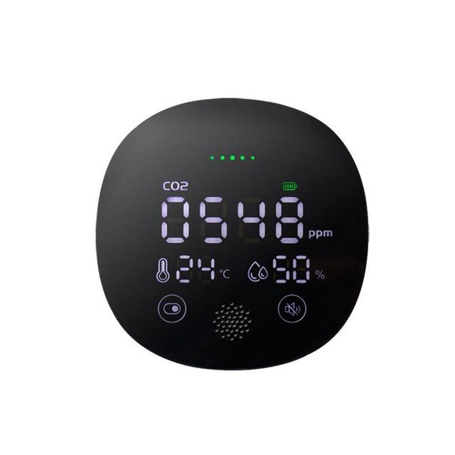 - Große LCD-Anzeige zur gleichzeitigen Überwachung von CO2-Konzentration (5000-ppm-Bereich), Temperatur und Luftfeuchtigkeit