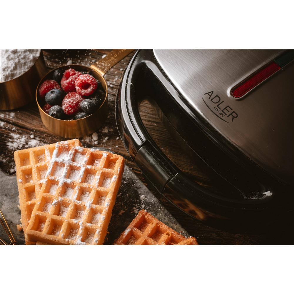 Der Multifunktionstoaster ADLER AD 3040 verfügt über fünf Funktionen in einem! Mit seinen 1200 W Leistung toastet er nicht nur Sandwiches, sondern grillt auch von beiden Seiten, backt knusprige Waffeln und Erdnussbutterkekse. Das Gerät ist mit 5 Arten von austauschbaren Sandwichplatten ausgestattet: für getoastete Sandwiches (Platte mit Dreiecken für dünnere Sandwiches), für traditionelle Sandwiches (Platte mit quadratischen Vertiefungen für dickere Sandwiches), zum Grillen (Platte mit Längsrillen), für Waffeln (Platte mit "Schachbrettmuster"), für Kekse und Kuchen (Platte mit Rillen für Teigkugeln).
