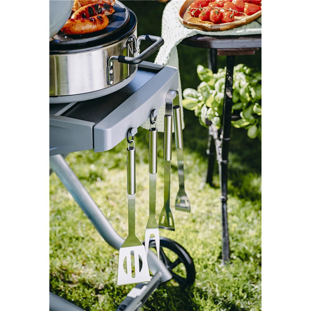 Werkzeug-Set: Das Set enthält: einen Spatel mit geschärfter Kante (35,4 x 7,7 cm), der das Wenden und Servieren von Speisen erleichtert, eine Gabel (35,3 x 3,4 cm), die sich ideal zum Festhalten von Fleisch beim Schneiden oder Wenden eignet, und eine Zange mit 8 Zinken (34,5 x 4,2 cm), die einen sicheren Halt bietet und beim Umgang mit gegrillten Speisen unverzichtbar ist.