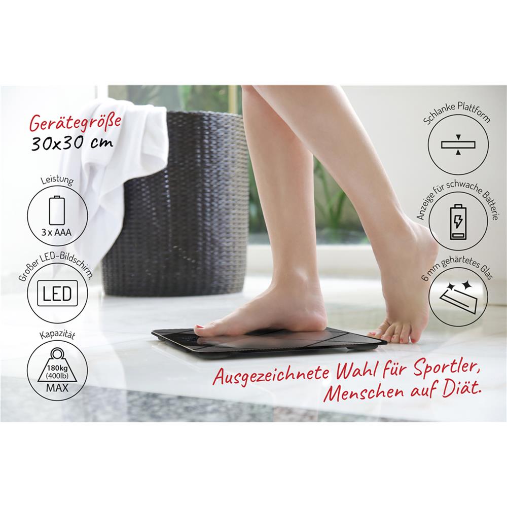 Präzise elektronische Personenwaage mit einer Höchstlast von 180 kg. Hergestellt aus strapazierfähigem gehärtetem Glas, ausgestattet mit einer rutschfesten Oberfläche sorgt für Sicherheit der Nutzung und ästhetisches Aussehen. Die hohe Genauigkeit (100 g) ermöglicht eine präzise Messung. Die Waage hat die Funktion der Rückstellung des Ergebnisses und Indikatoren: Überlastung und Batterieverbrauch. Die automatische Abschaltung hilft, Energie zu sparen und erhöht den Benutzerkomfort.
