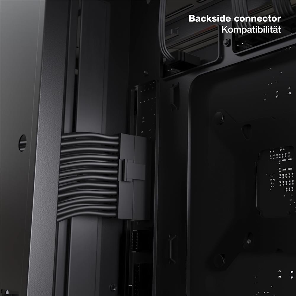 Das Mainboard-Tray unterstützt Backside Connector Designs wie Asus BTF (Back to Future), MSI Project Zero und Gigabyte Project Stealth für einen optisch ansprechenden, kabelfreien Auftritt.