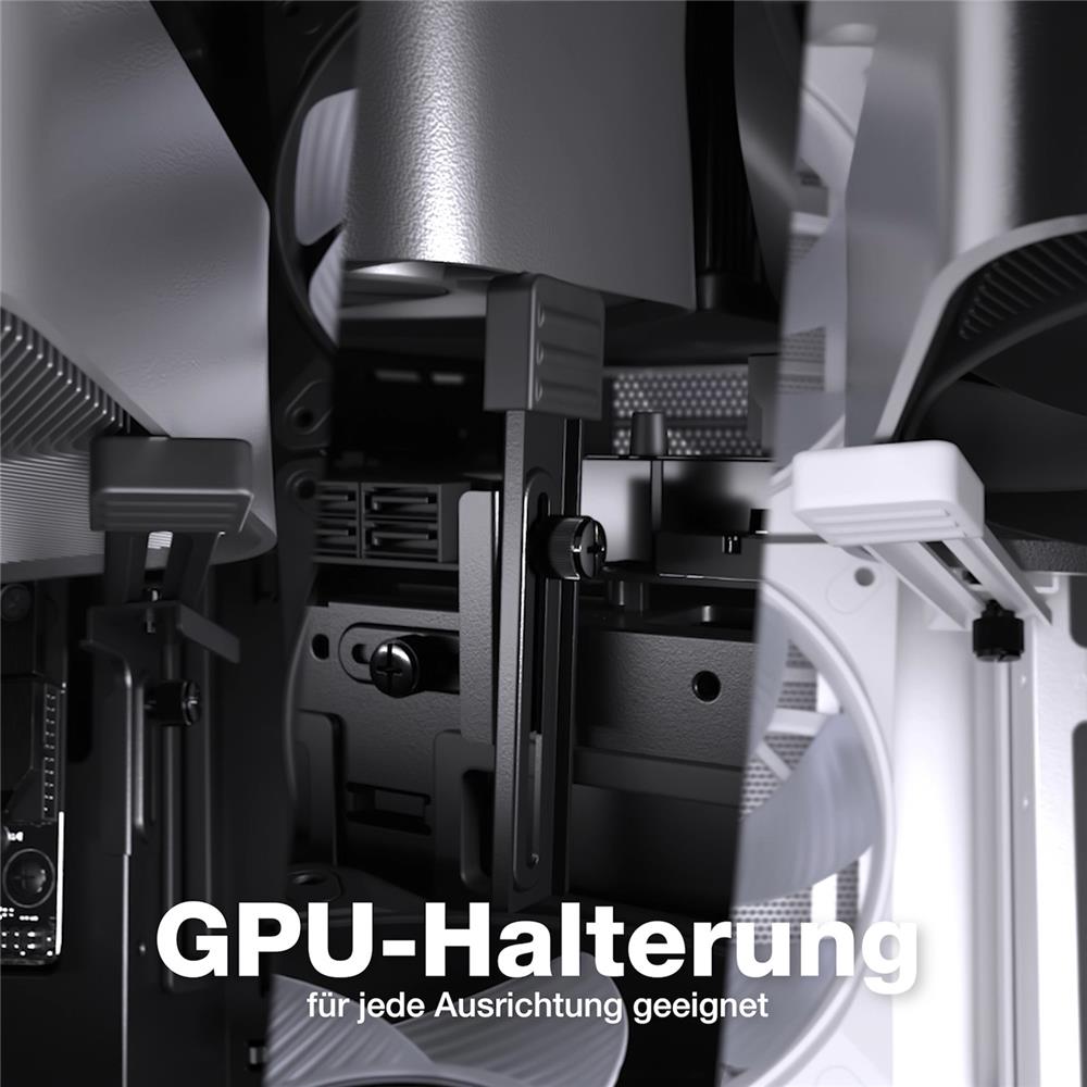 Light Base 600 DX Black kommt mit einem flexiblen Grafikkartenhalter der subtil deine Grafikkarte am Absinken hindert. Das Beste daran: Der Grafikkartenhalter funktioniert in alle Richtungen, sowohl mit horizontal als auch vertikal installierten GPUs. Somit sieht dein System selbst mit schwerster Hardware aufgeräumt aus.