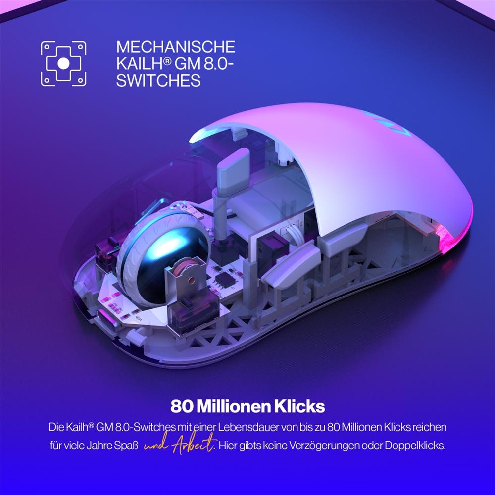 Kailh GM 8.0 Microswitches sind superschnell und robust. Sie überleben sogar bis zu 80 Mio. Klicks und gehören somit zu den zuverlässigsten Microswitches der Welt.