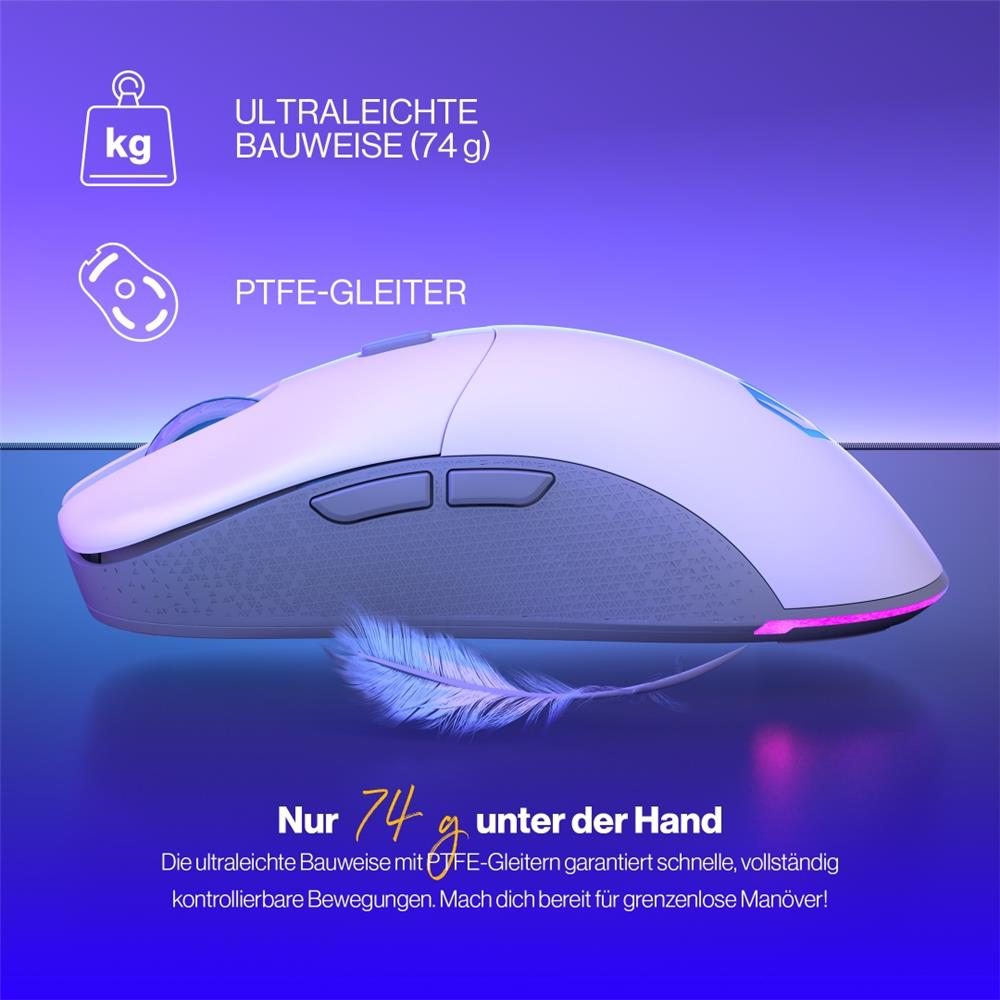 Der verbaute Sensor weist die Empfindlichkeit von bis zu 26 000 DPI auf, sodass jede Mausbewegung in ein weitreichendes Manöver auf dem Bildschirm verwandelt wird. Das alles wird von dem weißen Gehäuse und einem Gewicht von nur 74 g getoppt – inklusive eines Akkus und einer ARGB-Beleuchtung!