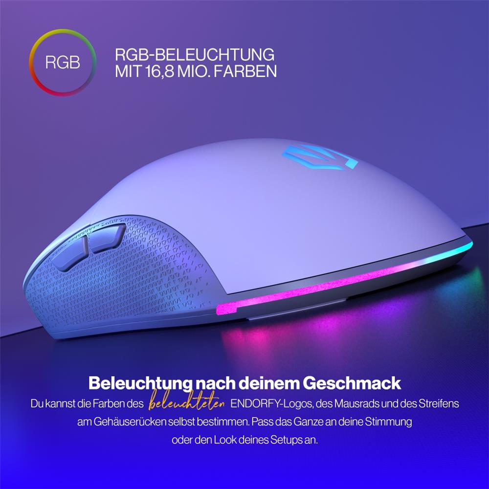 Schöne Effekte! Das ENDORFY Logo, das Scrollrad und ein Streifen am unteren Rand des Gehäuses lassen sich beleuchten. Wähle deine Lieblingsfarbe aus oder nutze einen der vorinstallierten Farbeffekte – alle Einstellungen lassen sich kinderleicht dank der funktionalen Software anpassen.