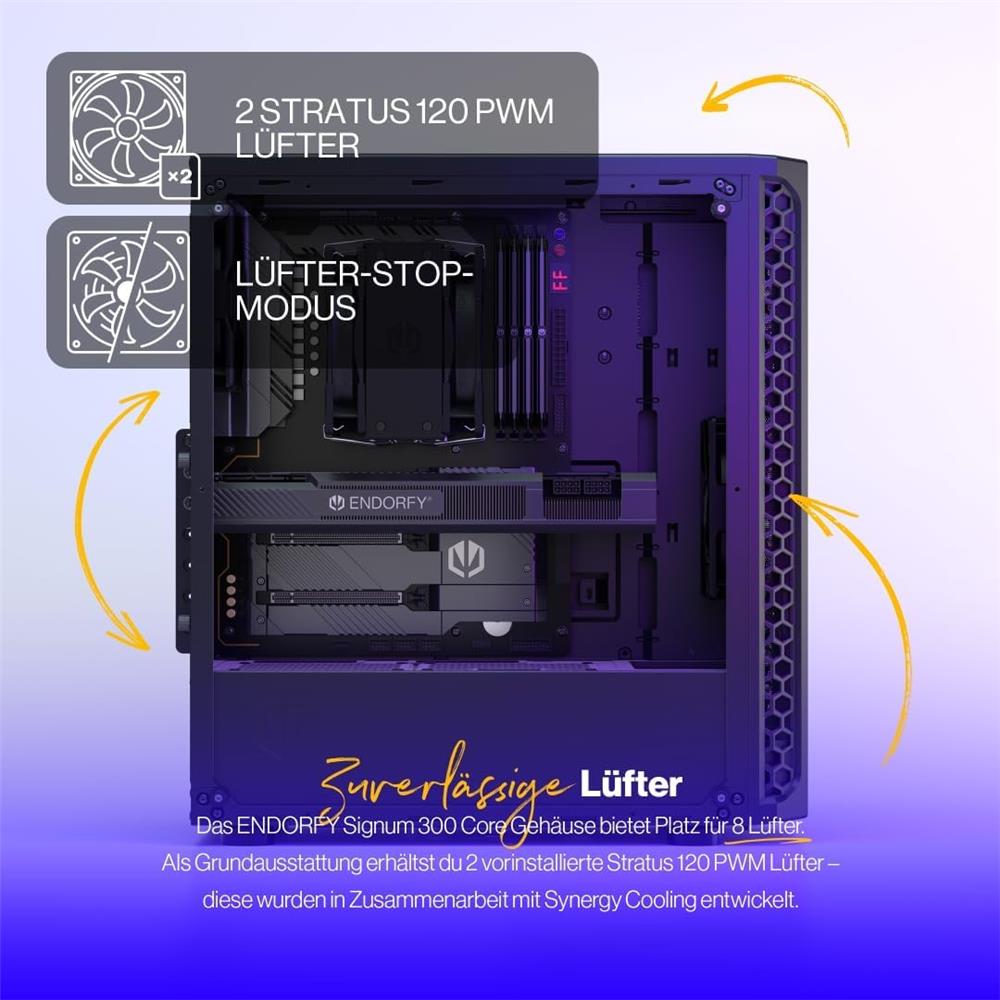 Das ENDORFY Signum 300 Core bietet genug Platz für 4 x 2,5” Laufwerke (oder 2 x 2,5” und 2 x 3,5” Laufwerke), eine große Grafikkarte (von bis zu 325 mm) und bis zu 8 Lüfter. Zu Beginn bekommst du zwei Stratus 120 PWM Lüfter von uns – ein Startgeschenk!