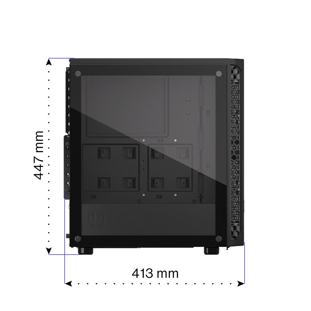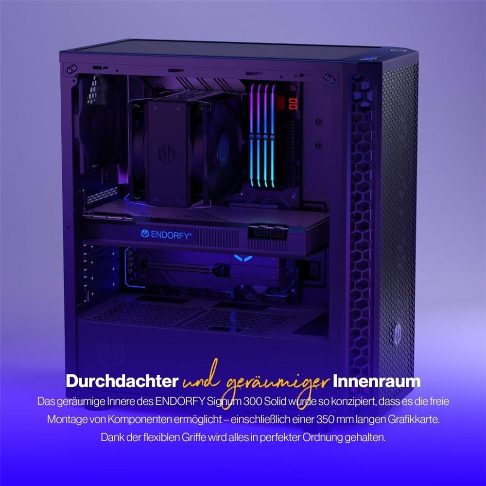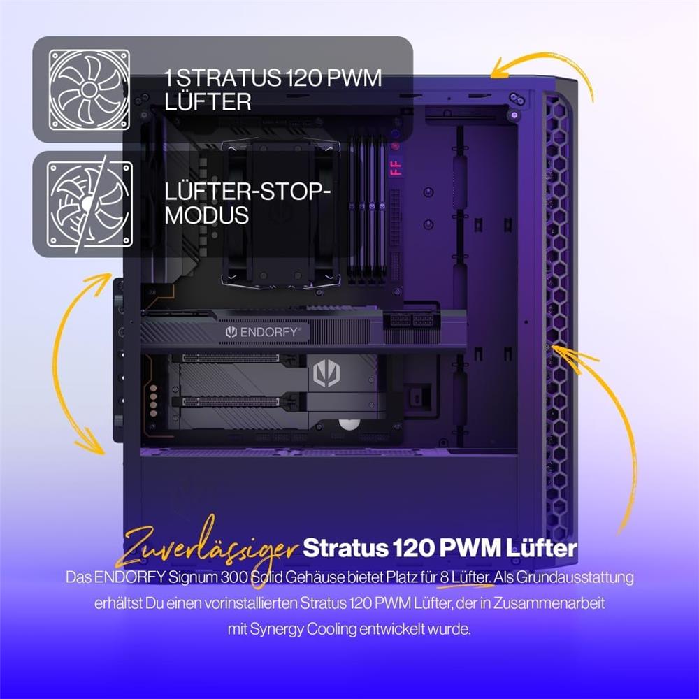 Das ENDORFY Signum 300 Solid wurde so entworfen, dass es beeindruckt, und wir finden, es macht einen ziemlich guten Job – das Gehäuse sieht cool aus und sorgt für einen konstanten Luftstrom um die PC-Komponenten. Sie können problemlos einen hohen CPU-Kühler und eine 350 mm lange Grafikkarte unterbringen. Es gibt auch Platz für acht Lüfter – darunter einen Stratus 120 PWM, den wir beilegen.