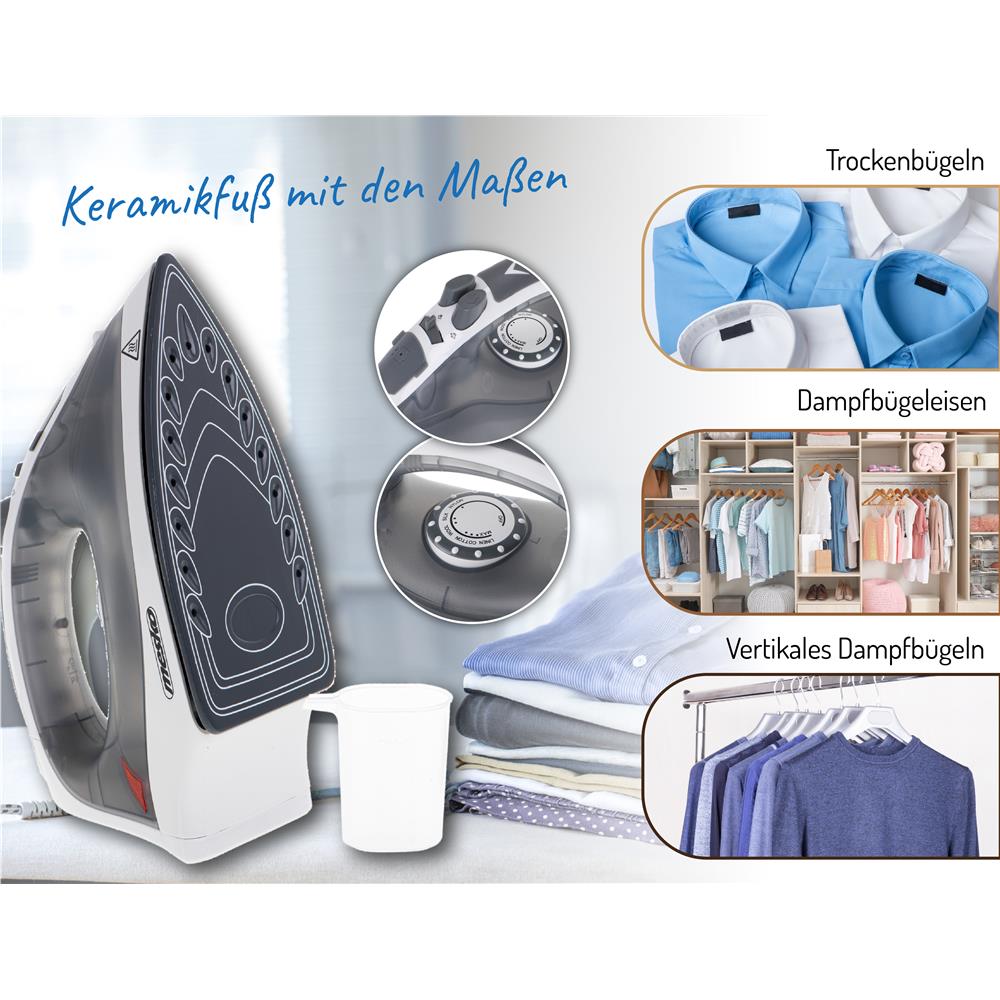 Dampfbügeleisen Mesko 5037 in einer universellen grauen Farbe. Unter einem eleganten Gehäuse verbirgt sich eine wirklich starke Leistung von 2800 W. Dieses moderne Gerät mit Keramiksockel ermöglicht es Ihnen, senkrecht zu bügeln. Dank des Keramikfußes gleitet es leicht über die Oberfläche des Materials, was den Komfort für den Bügler erhöht. Die Keramikbeschichtung der Sohle ist kratzfest, so dass Sie keine Angst haben müssen, um Knöpfe oder Reißverschlüsse herum zu bügeln. Dank des starken Dampfstoßes können Sie selbst die lästigsten Falten beseitigen. Der Wassertank hat ein Fassungsvermögen von 170 ml, also genug, um die Kleidung der ganzen Familie zu bügeln!
