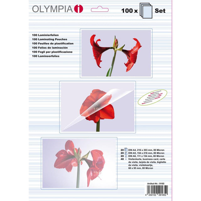 Olympia Laminierfolien-Set 100 Stück (A4, A5, A6, Visitenkarten) 80 Micron